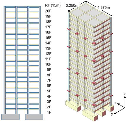 鉄筋コンクリート造建物の長周期地震動に対する耐震性を調べるために防災科学技術研究所兵庫耐震工学センターのE-ディフェンスを使用して振動試験「長周期地震動に対するRC造建築物の安全性検証方法に関する検討」が実施されました。対象試験体は、実在する階高3m、高さ60mの超高層RC造建物を参考にして作成されました。図6に試験体の軸組図および外観図を示します。参考建物の1/4縮尺、即ち、階高0.75m、高さ15mのRC造建物です。振動試験は、入力地震波として2011年東北地方太平洋沖地震の観測波および南海トラフを震源とする三連動地震を想定して作成された模擬波が使用され、建物が終局状態に至るまで行われました。